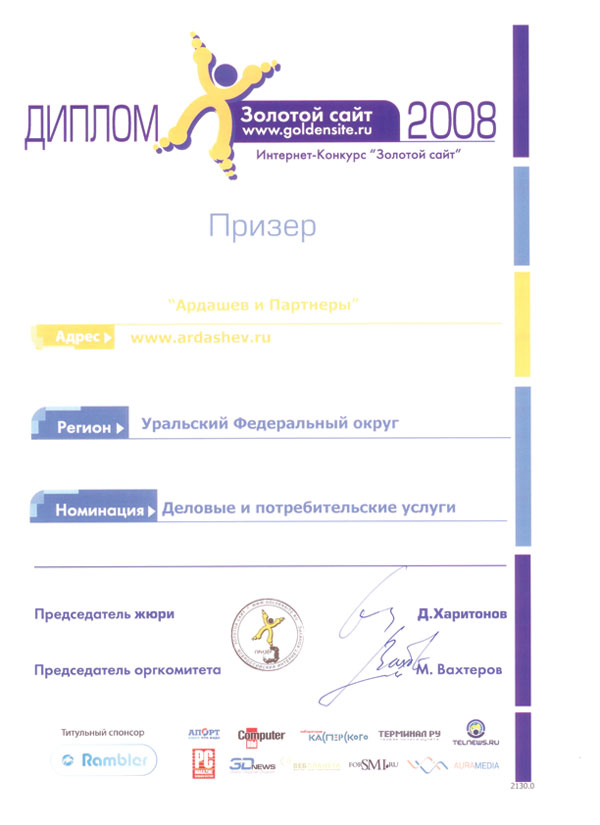 10 февраля 2009 г. – сайт Консалтинговой группы «Ардашев и Партнеры» стал призером интернет-конкурса «Золотой сайт-2008» и занял второе место по Уральскому ФО в номинации «Деловые и потребительские услуги».